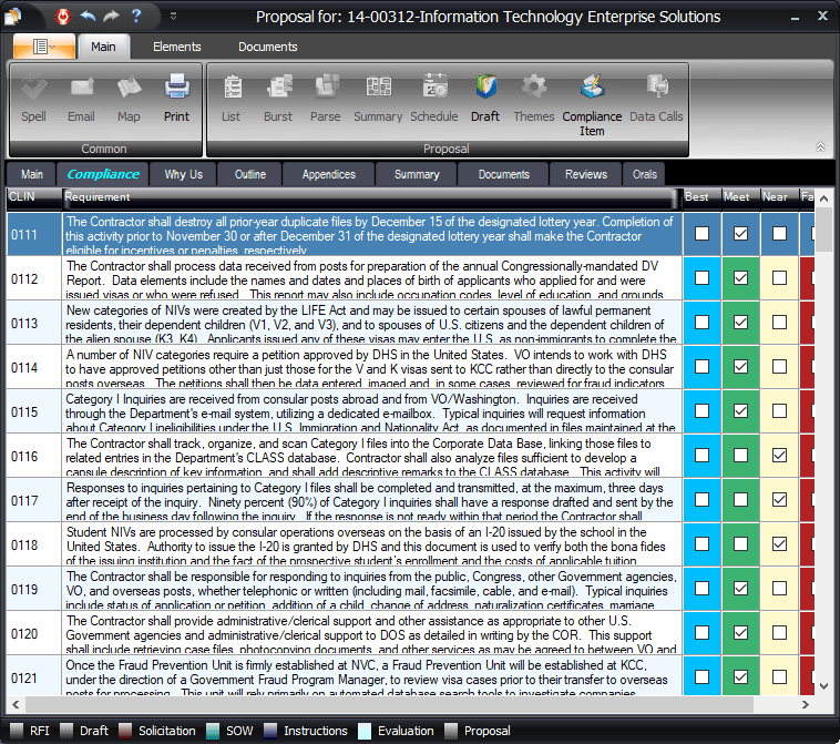 La función de cumplimiento de la propuesta ayuda al usuario a crear una tabla de cumplimiento para determinar las áreas en las que la empresa del usuario necesitará asistencia. Los usuarios definen si la prima excede, cumple, cumple parcialmente o no cumple con los requisitos. Además, el usuario puede comentar los requisitos con sugerencias sobre fuentes potenciales para cumplir con los requisitos o abordar el problema. Los datos resultantes se incluyen automáticamente en el borrador de propuesta generado por el sistema.