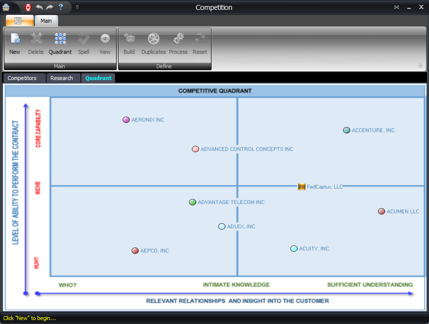 WinFedBiz provides a competitive analysis tool to define potential competitors based on information the company maintains within the partners' repository. Whenever one kicks off a new project, getting a list of key competitors is a crucial first step. This helps the company understand the market and uncover various competitor tactics. An in-depth investigation and analysis of your competition is one of the most important components of a comprehensive market analysis. A competitive analysis allows you to assess your competitor's strengths and weaknesses in the marketplace and implement effective strategies to improve your competitive advantage.