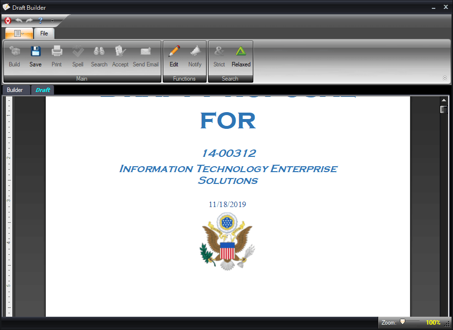 As an example, the draft proposal is created with responses for each requirement. The user may select up to 10 responses for each requirement as a result of a building block search. The results are presented to the SMEs in the draft format where the SME has a basis for a response. Preferably, the response selections willk hava an exact match fro a previous proposal. Otherwise, the SME may combine elements of each result or choose to rewrite the response entirely.