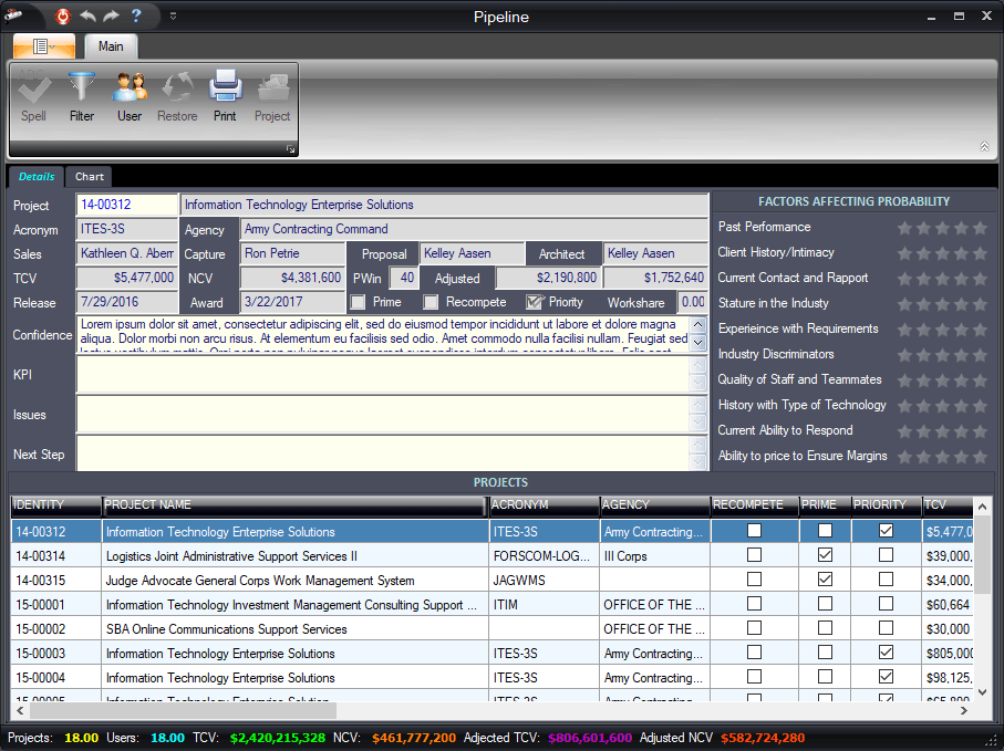 We base the WinFedBiz forecasting model on “customer-centricity” in both focus and execution. The actions taken by the buyer drive movement through the pipeline, moving closer to a buying decision, and change dramatically as they move from step to step through the decision process.